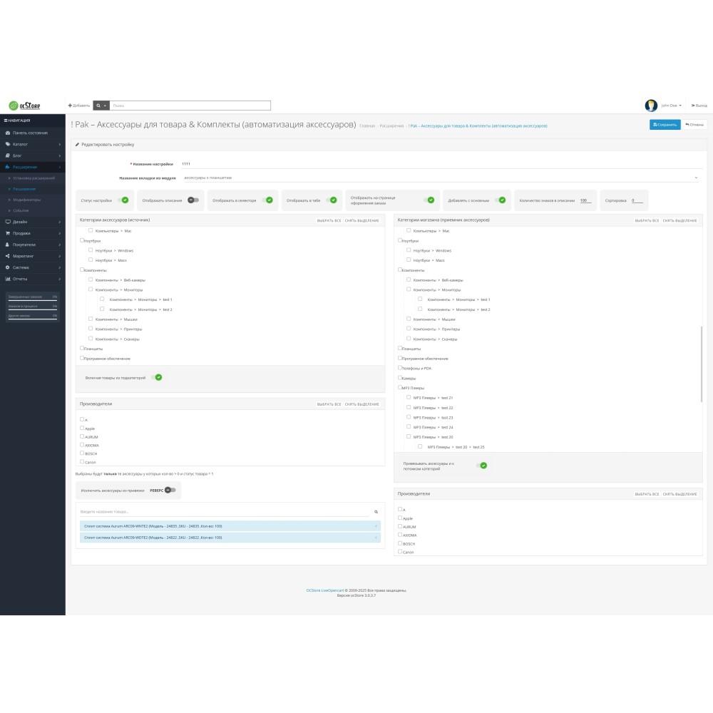 Автоматическая привязка аксессуаров – больше не нужно вручную связывать каждый аксессуар с основным товаром. Модуль автоматически назначает аксессуары товарам согласно заданным правилам.